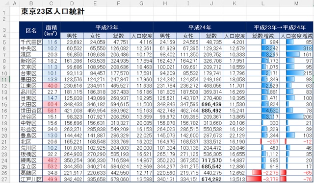 では、「平成23年→平成24年」の「人口密度増減」を水色のグラデーションのデータバーで表示してみます。